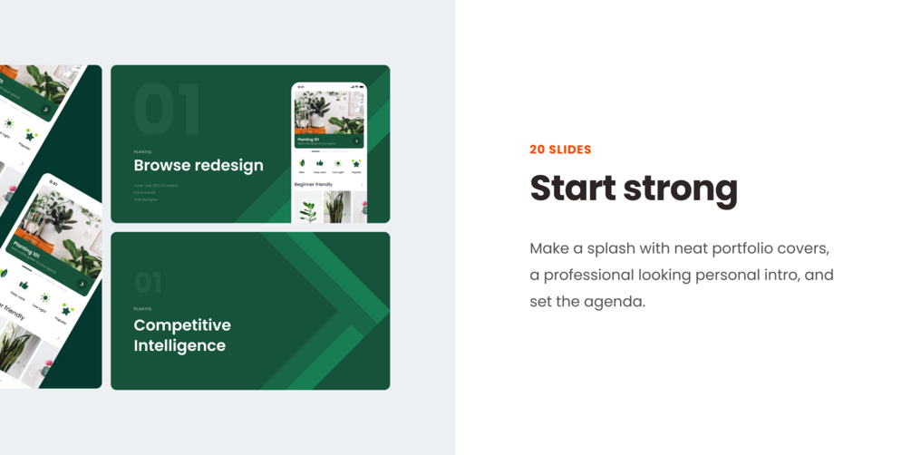 Start strong. Make a splash with neat portfolio covers, a professional looking personal intro, and set the agenda.
